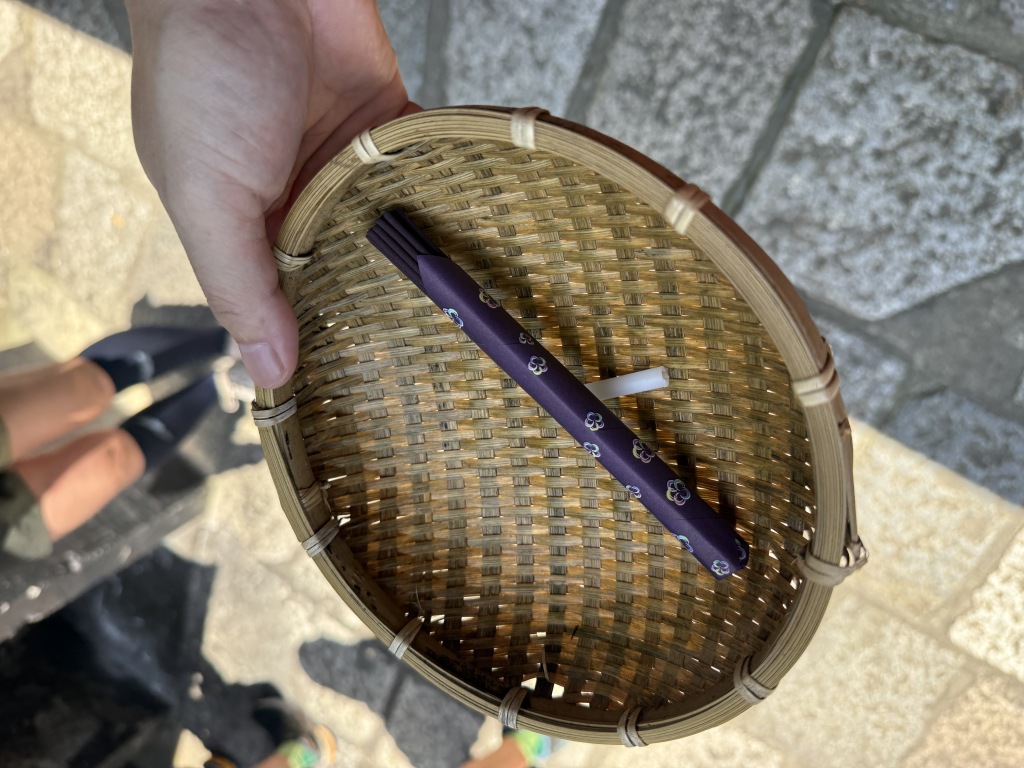 社務所にて、線香・ろうそくセット(100円)と、ザルを借りることができます。