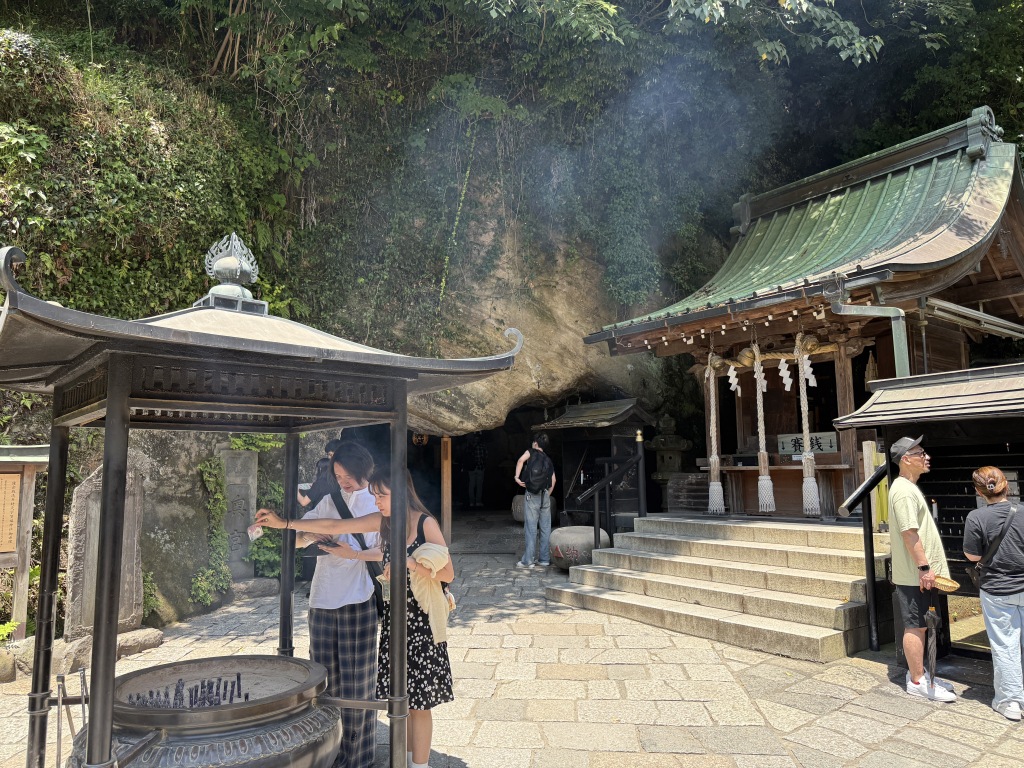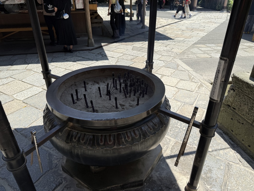 香炉にてしっかり線香の煙を浴びましょう。奥が銭洗いをする場所です。「銭洗水」で銭を洗うと、商売繁盛や金運向上にご利益があるとのこと。