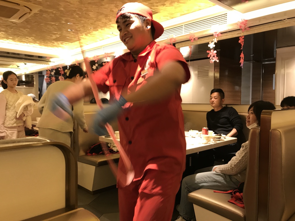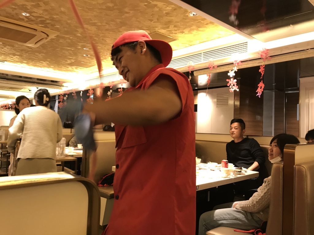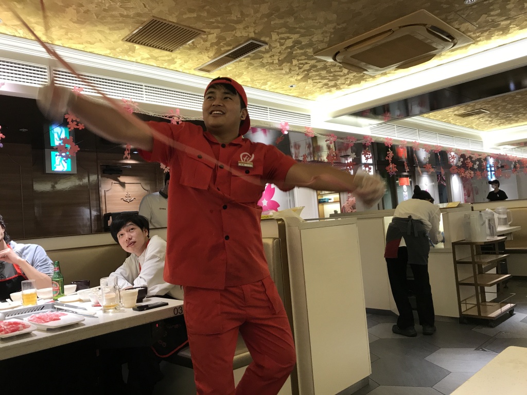 この火鍋店は味もさることながら、そのエンタテイメント性でも大変有名なお店。何がでてくんのやろーなー。