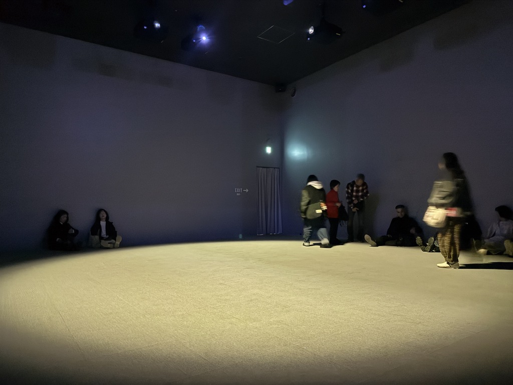 女優の山口智子さんプロデュースによる、世界の音楽文化を巡り、映像ライブラリーに収めるプロジェクト「LISTEN.」は、↓の写真の部屋の壁すべてがプロジェクターとなります。「美の黄金時代」のチケットの時間まで滞在しました。なお、一回の上映時間は約15分くらい。お客さんはこんな感じで壁に寄り添い、座って鑑賞するような感じです。