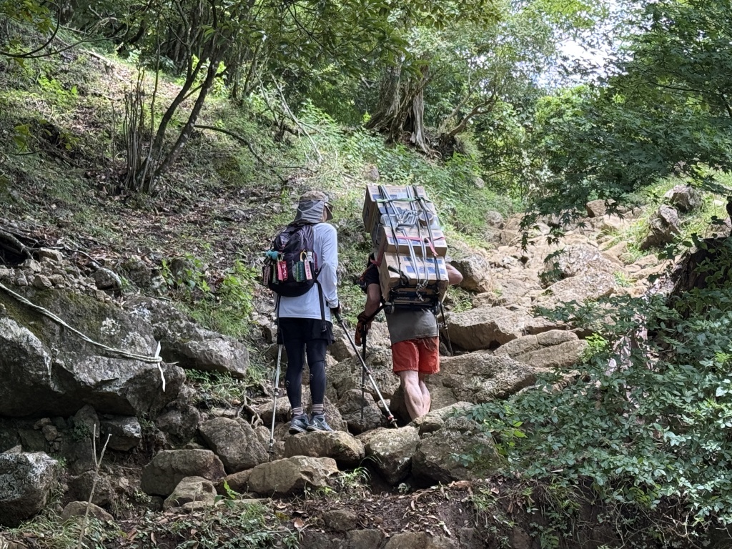 途中の山道で、でっかい荷物を抱えた男性とそのサポートの女性。山頂に物資を運んでいるんでしょう。いやあ、きついはず。