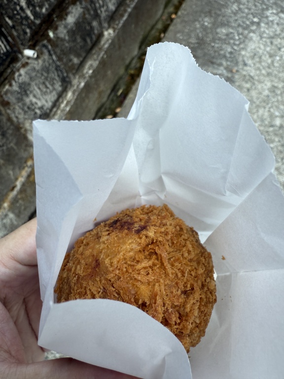 バス停留所に行くまでのこま参道にて大山グルメを堪能します。こちらは「大山とうふメンチカツ」。美味い。